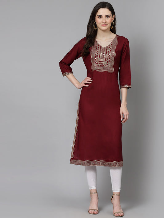 Women Embroidered Viscose Rayon Straight Maroon Kurti
