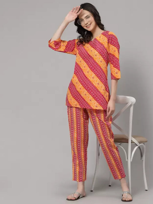 Women Top & Pyjama Set Red Jaipuri Printed