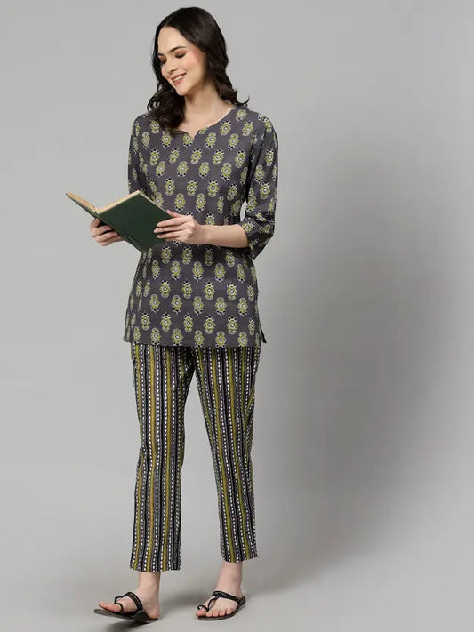 Women Top & Pyjama Set Grey Jaipuri Printed