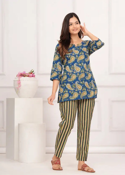 Women Top And Pajama Set Blue Jaipuri Printed