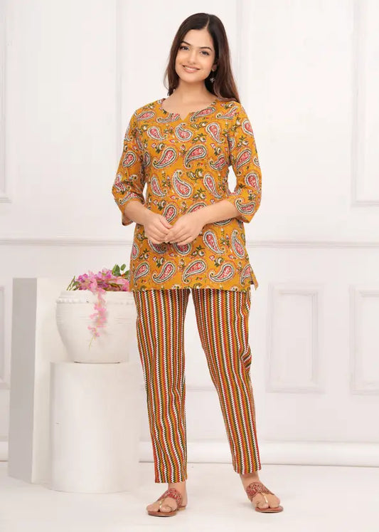 Women Top And Pajama Sets Mustard Yellow Jaipuri Printed