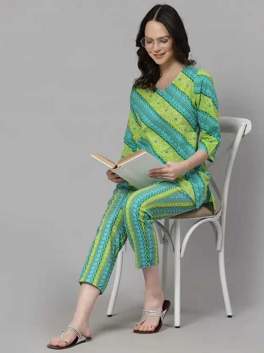 Women Top & Pyjama Set Green Jaipuri Printed