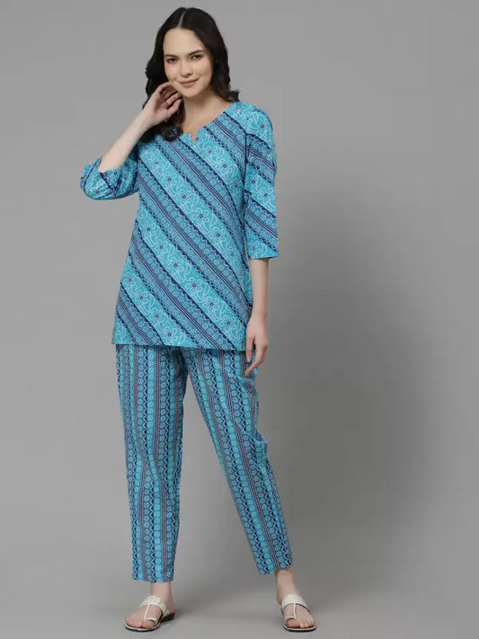 Women Top And Pyjama Sets Blue Printed