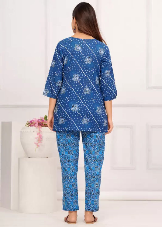 Women Top And Pyjama Set Blue Jaipuri Printed