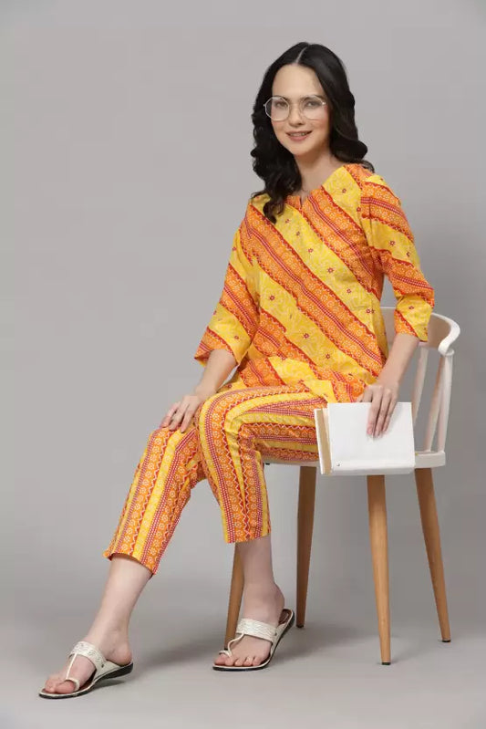 Women Top & Pyjama Set Yellow Jaipuri Printed