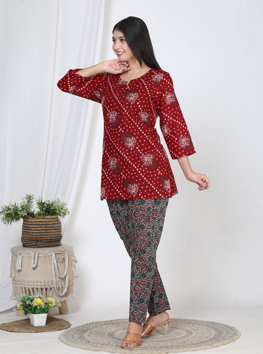 Women Top & Pyjama Set Red Printed