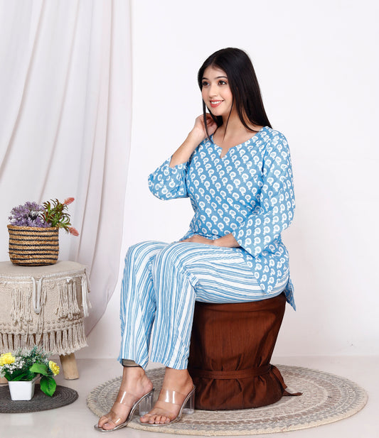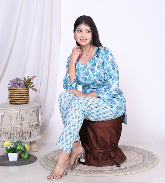 Women Top & Pyjama Set Blue Rose Printed