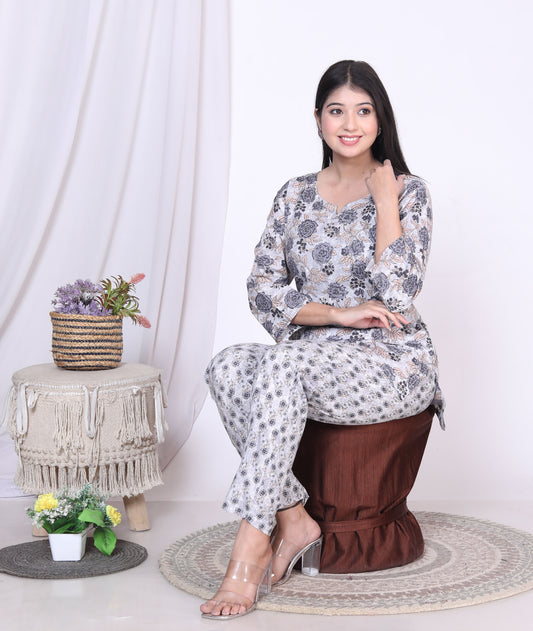 Women Top & Pyjama Set Gray Balloon Printed