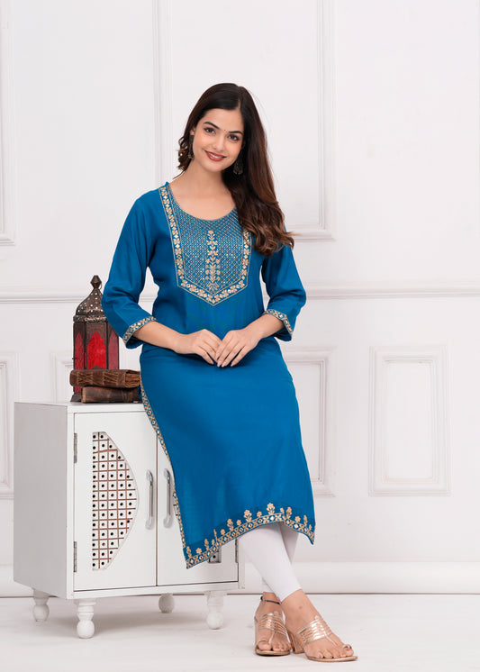 Women Embroidered Rayon Royal Blue Kurtis