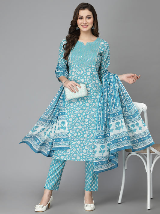 Women Pure Cotton Blue Kurta Pant Dupatta Set