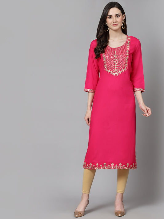 Women Embroidered Rayon Pink Kurtis