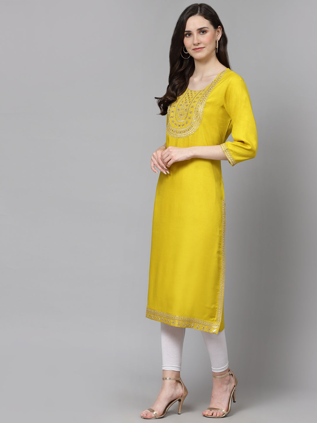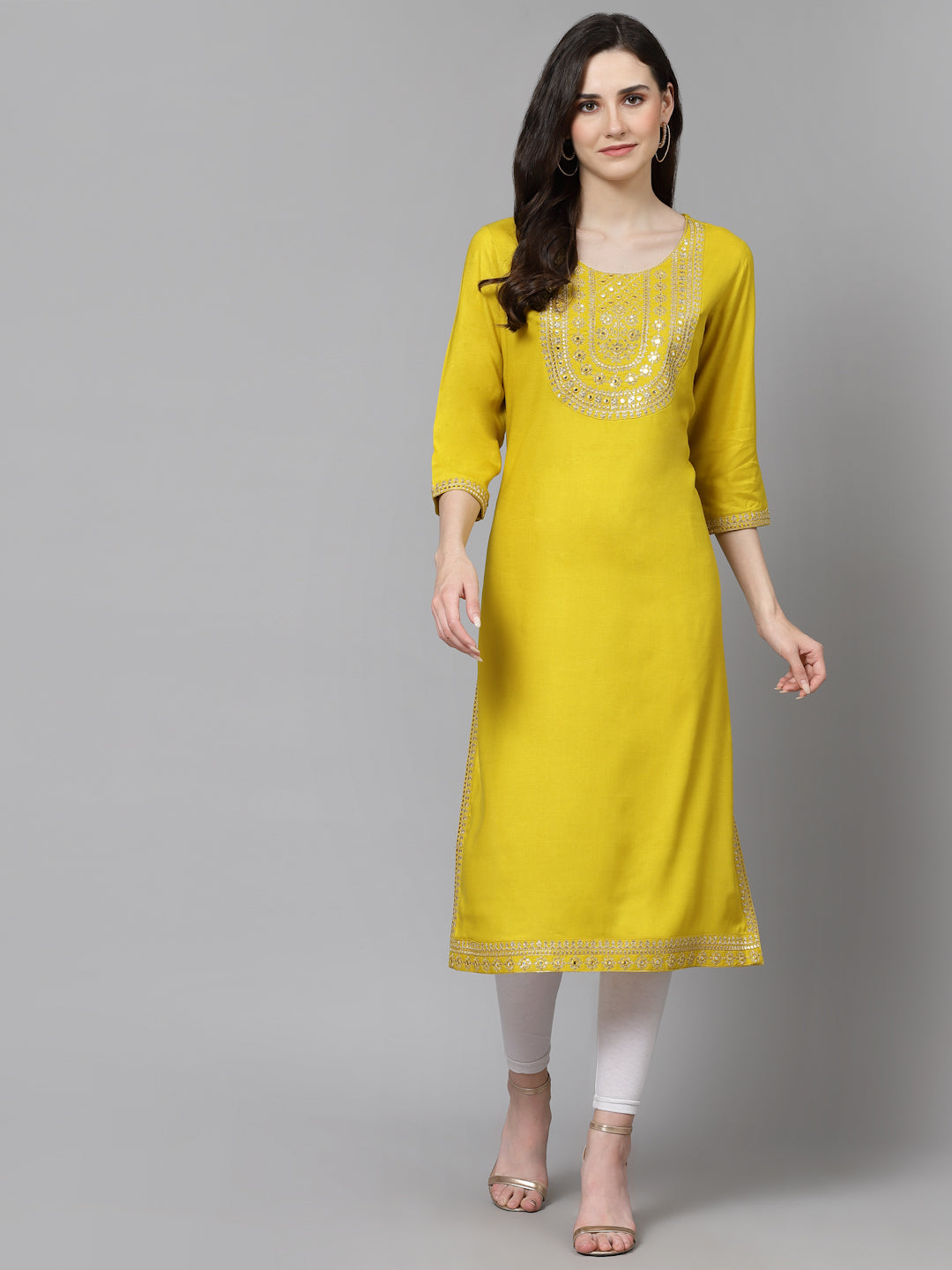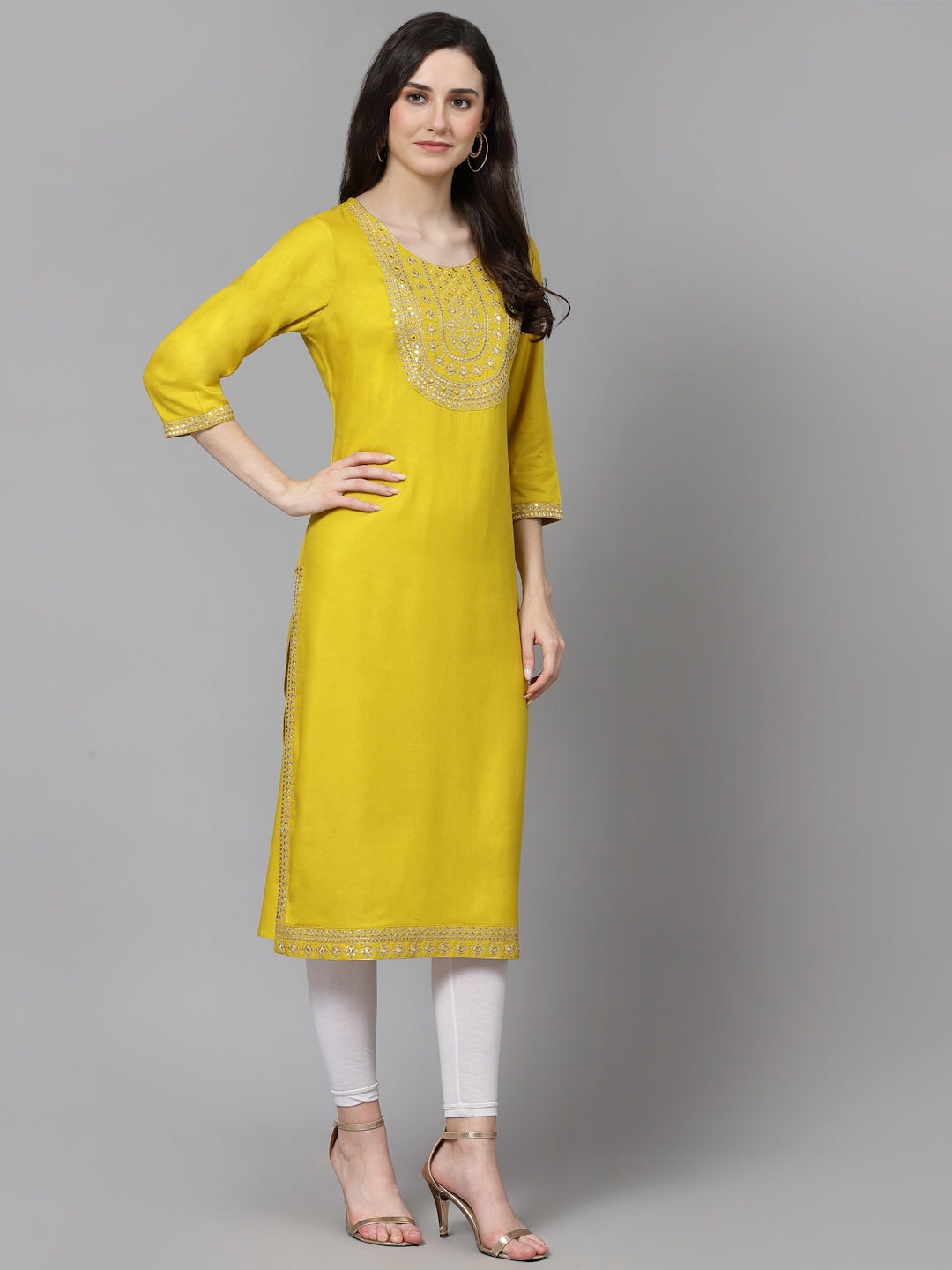 Women Embroidered Viscose Rayon Yellow Kurtis